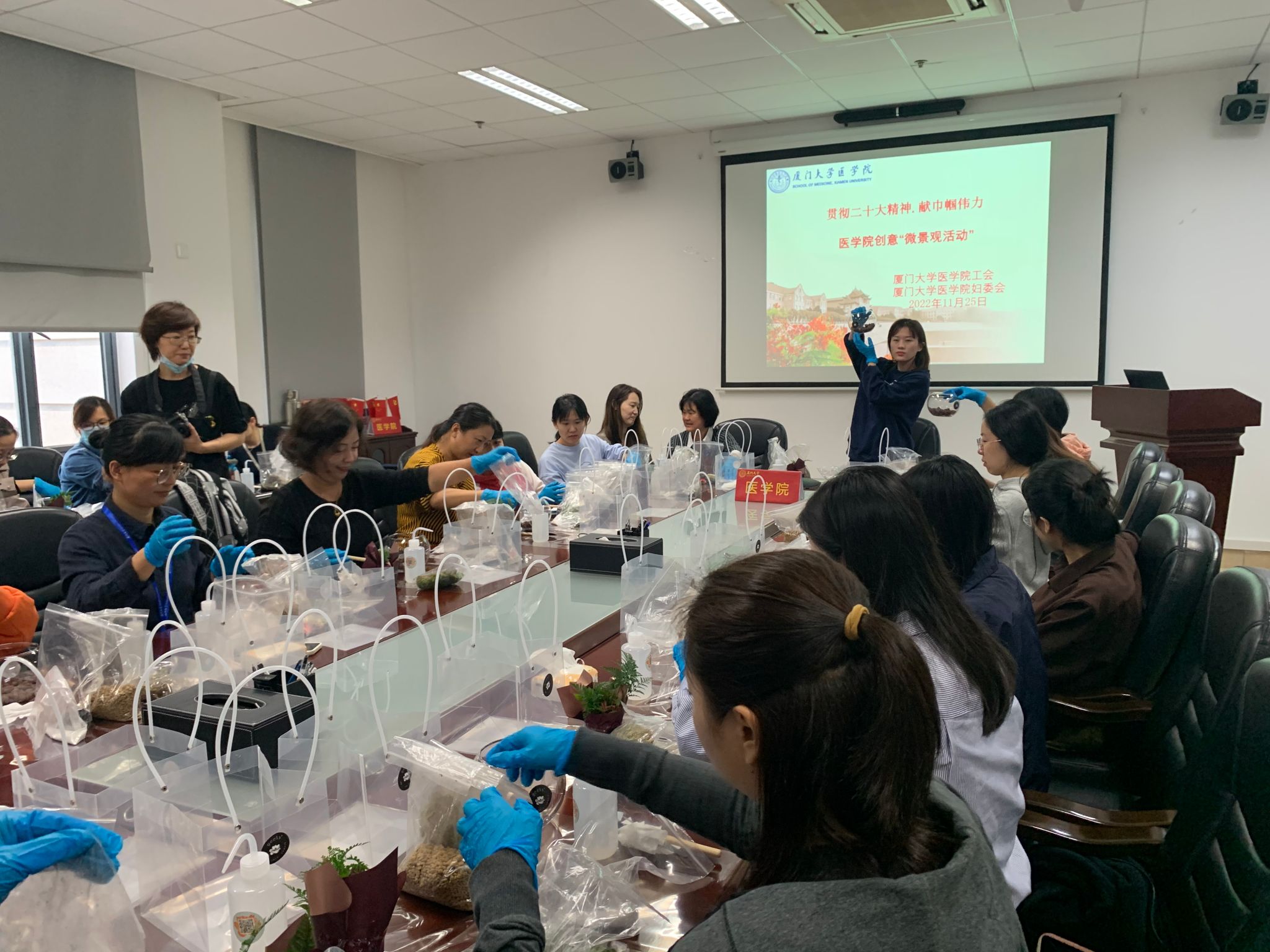11月25日,由医学院工会、妇委会联合举办的“贯彻二十大精神,献巾帼伟力”创意微景观活动在爱礼楼103会议室成功举办。医学院三十余名女教职工参加了本次活动。活动由医学院妇委会副主任李文君主持。