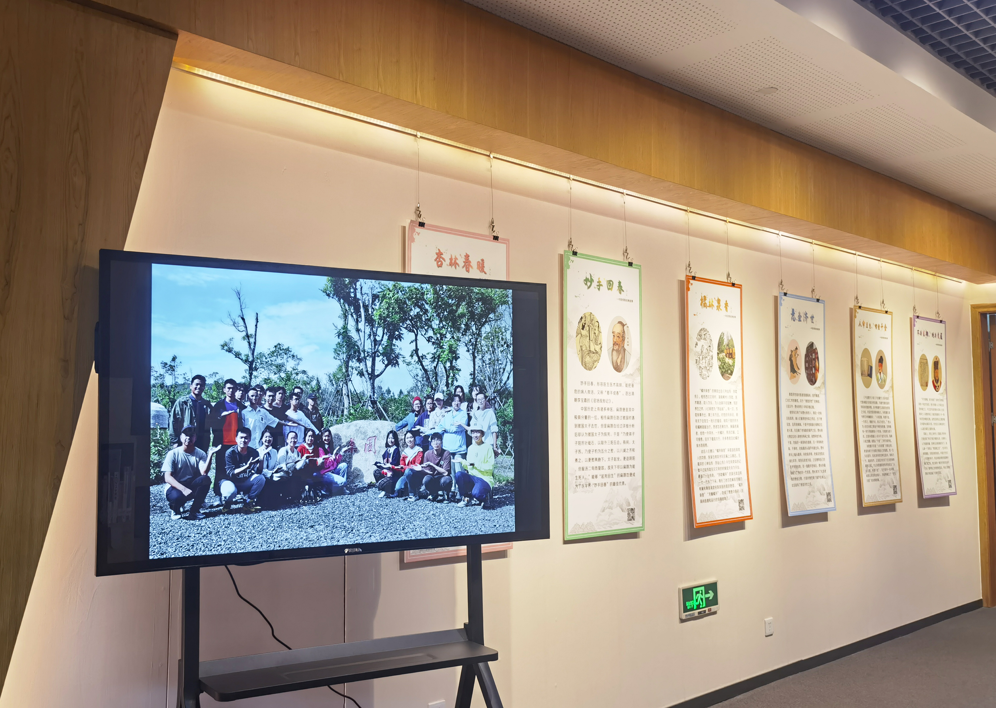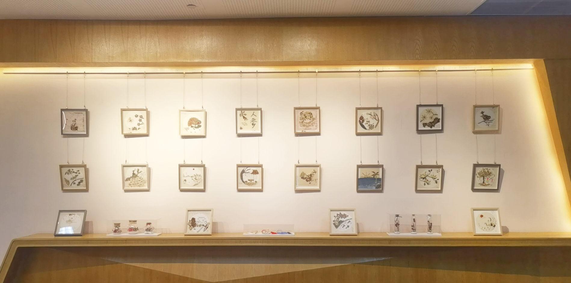 西侧展区展示的内容为我校中医学专业学生在专业实践及艺术创作方面的作品,主要包括拍摄制作药用植物解说视频、制作饮片贴画和永生花摆件、设计定制香囊、定期在公众号推送“中医传统经典故事”“中国医史人物述评”“杏仁学堂”“杏仁札记”等中医药相关内容进行科普宣传,不仅充分展现了我校中医学专业学生的风采,增强了学生的文化自信和专业自信,同时也利用实践成果宣传中医药文化,激发师生对中医药文化的兴趣。