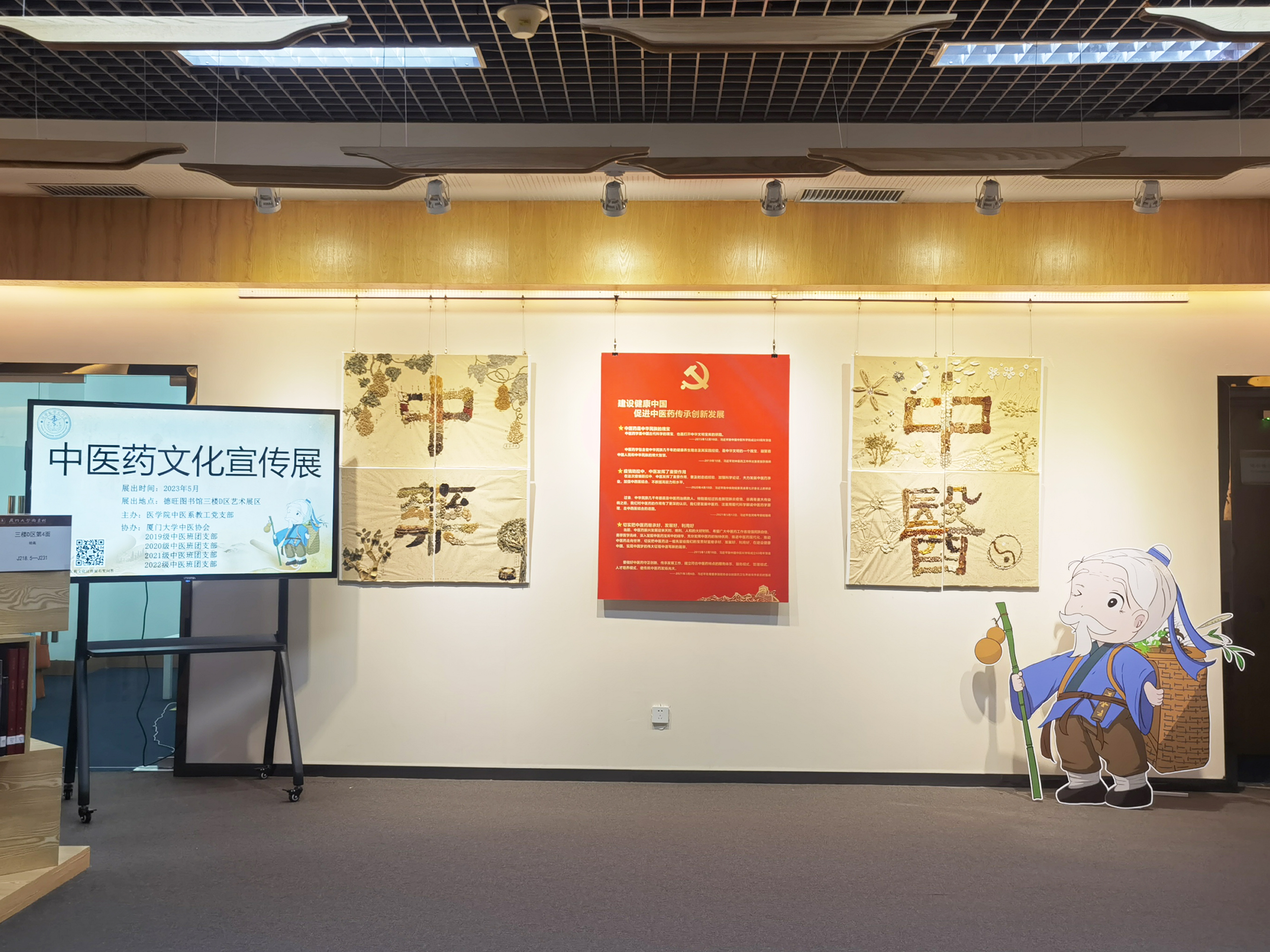 左右两侧的两块展板分别为2020级中医班团支部和2021级中医班团支部设计制作的“中医”和“中药”字样的饮片贴画,由两百多味中药饮片组合而成。右侧还设立了以“药王”孙思邈为理念设计的中医系药园形象“妙真子”。