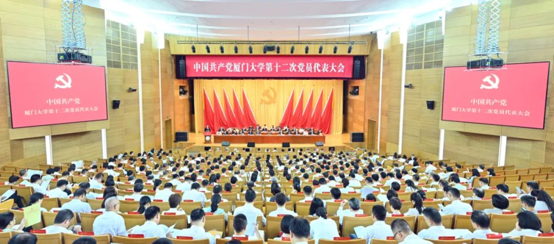 当天的会场内气氛庄严热烈。主席台上方悬挂着“中国共产党厦门大学第十二次党员代表大会”的会标,后幕正中是镰刀和锤头组成的党徽,10面鲜艳的红旗分列两侧,会场后面伫立的展板上书写着“牢记嘱托、勇担使命,为与时俱进建设世界一流大学而团结奋斗!”的大幅标语。