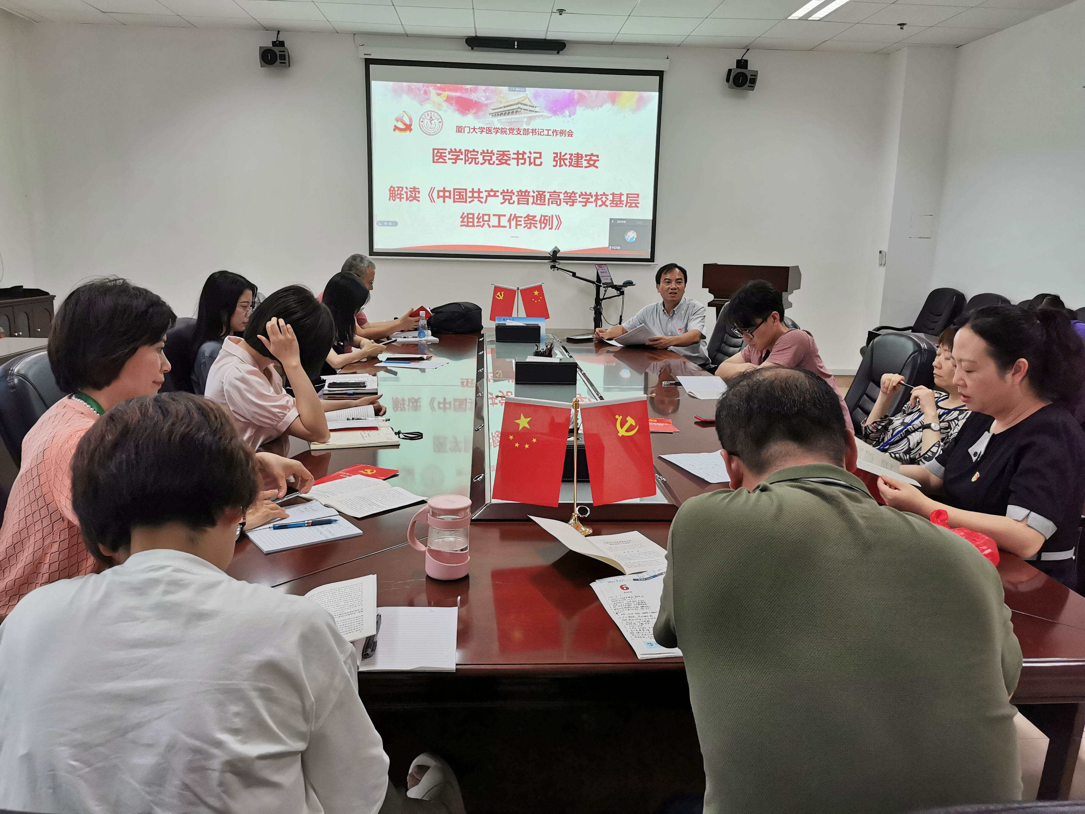 2021年6月16日中午,医学院党支部书记工作例会在医学院爱礼楼103会议室召开。例会采用线上和线下同步进行的方式举办,医学院全体教工支部书记和学生支部书记参加了例会。会议由学院党委张建安书记主持。