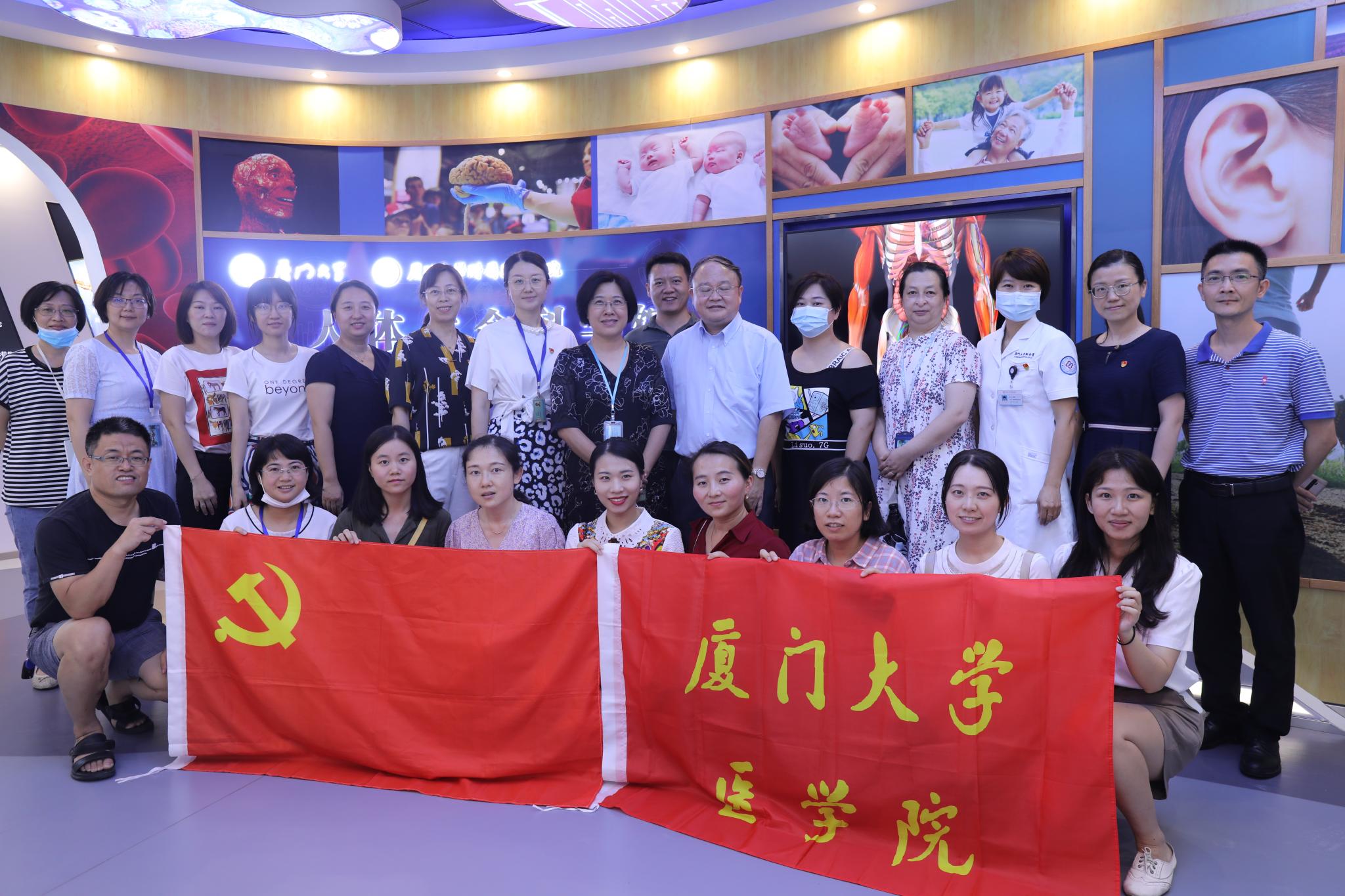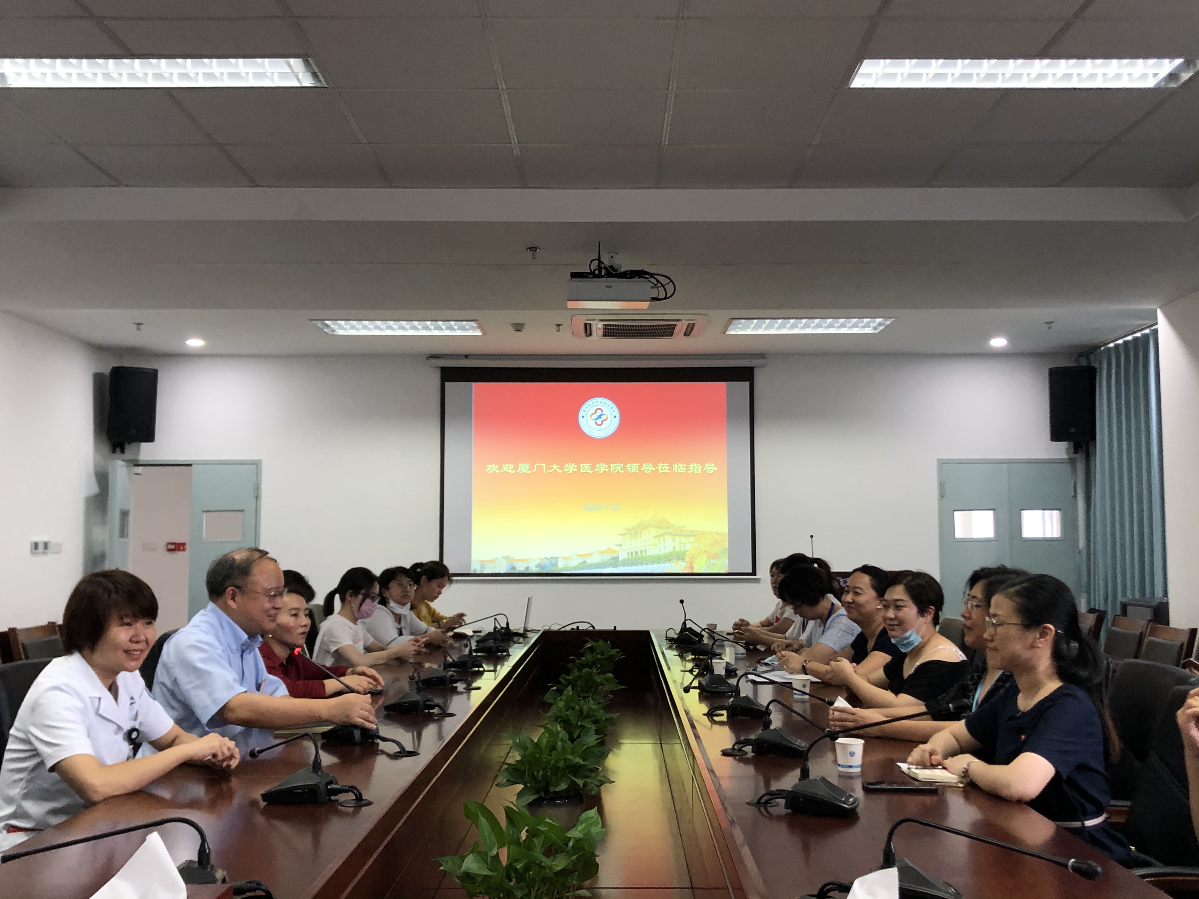医学教育是一个连续统一的整体,需要医学院和附属医院全体医教研人员的共同努力。2020年7月10日下午,为促进医学院和直属附属翔安医院的沟通交流,医学院谢莉萍副院长带领医学院行政教工党支部的教师党员和群众到翔安医院国家临床教学培训示范中心参观学习并座谈。翔安医院程继东副院长及示范中心、人事部、科教部、院办、财务、设备物资等相关负责人参加了活动。