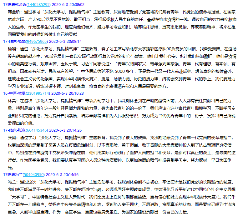 学生党员李鑫钰同志认为作为90后党员,应更加明白自己身上所肩负的重任,天将降大任于斯人也,必先苦其心志,劳其筋骨,磨砺自己,才能更好地为人民服务。叶佳希同志认为在当前,我们既要增强忧患意识、强化底线思维,又要具备逆水行舟的胆识、能力、毅力,危中求机、化危为机,进一步提振争先进位、跳起摸高的昂扬锐气。林曼滢同志表示,“通过“深化大学习,提振精气神”专项活动学习,深刻体会到青年人应该积极行动,让青春在党和人民最需要的地方绽放绚丽之花。”韩金昕同志表示,作为医学生,理应向前辈看齐,努力学习专业知识,培养临床思维,提高思想觉悟,养成奉献精神,将来在祖国需要的时候能够做出自己的贡献。冯兰同志表示,“通过这次‘深化大学习,提振精气神’主题活动学习,我深刻体会到不忘初心、牢记使命的真谛。我们决不能满足于一时的进步,决不能在舒适中沉醉,必须巩固好主题教育成果,继续深化学习习近平新时代中国特色社会主义思想。”