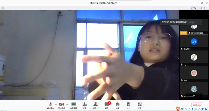 创新科普形式,提升防控效果。为做好本次线上科普讲座,护理系教工党支部高度重视,组织护理系学生结合受众的特点,对讲授内容进行精心编排,并提前进行预演,确保授课质量和效果。本次讲座通过腾讯会议直播平台由厦门大学医学院护理系学生主讲,向厦门外国语学校的学生普及新冠肺炎的相关知识,以及如何做好防护工作,为返校学习生活做好准备。讲座过程中,2017级护理班的马卓同学分别从居家、返校、复课三个方面对如何防控新冠病毒进行了详细的讲解,对于复课后的防护措施,分别强调了在教室、宿舍、实验室、食堂等场所活动时的注意事项,为复课后学习生活提供了全面的指南;2018级护理班的陈玉蕾同学通过展示糖果在身体里的“旅行”,向初中生们普及合理膳食的健康观念;最后,2018级护理班的刘玲萍同学基于目前线上教学现况,向厦外的同学们宣传如何缓解眼睛疲劳、保护视力、预防近视等知识。