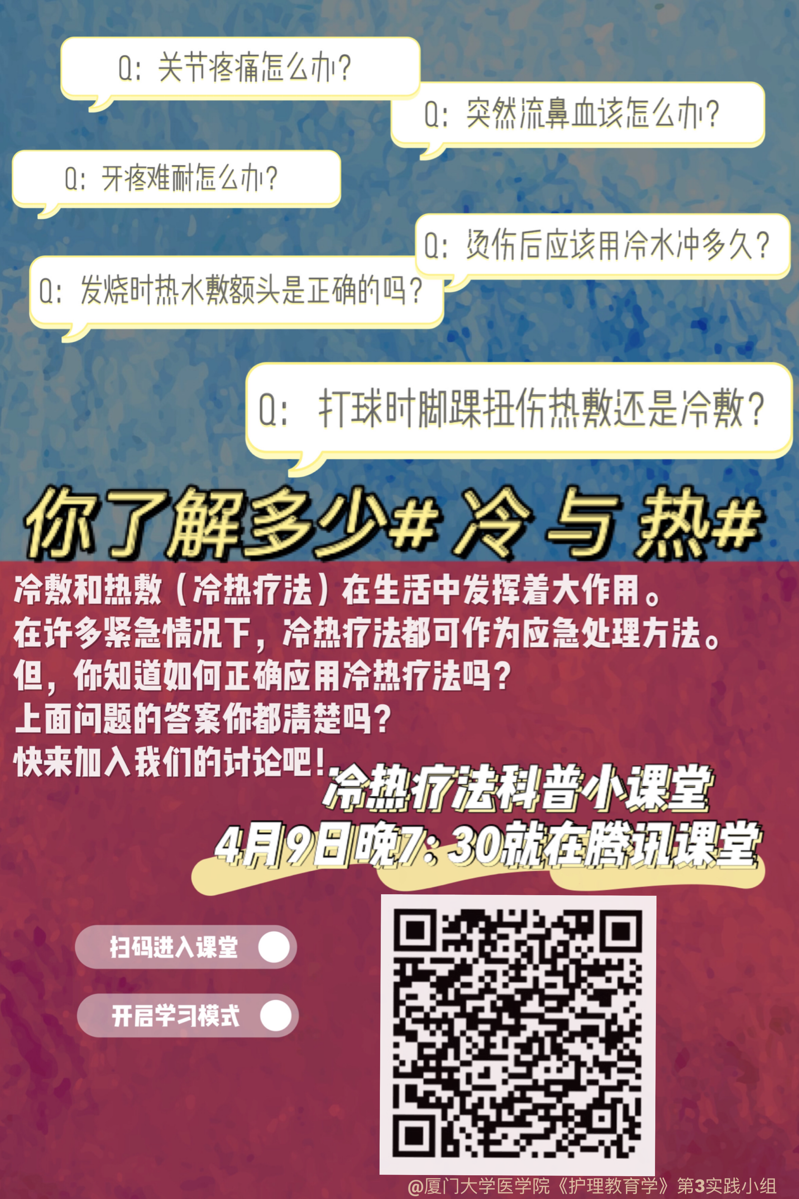 当前疫情时期,护理系教工党支部积极思考“党员能为疫情防控做什么”,除了踊跃的参加疫情相关志愿者服务之外,通过云端把专业所长与疫情防控紧密地结合起来,担起战胜新型肺炎疫情的使命,护理系教工党支部的全体成员们齐心协力与国家和人民同呼吸、共命运。通过本次云端科普活动,支部党员为守护疫情下师生的身心健康做出了自己的努力,参与的厦大护理系的学生们也学会了理论联系实践,运用教育学理论组织一堂课程,也由此更加坚定了运用专业知识帮助更多的人的信念,强化了作为未来“白衣天使”角色的担当和使命,展示了厦大医学学子的良好风采。一个党员就是一面旗帜,在疫情面前更应该有“我是党员,我先上!”的思想觉悟。在疫情面前,只要我们同舟共济,同心协力,一定能够打赢这场没有硝烟的疫情防控阻击战。