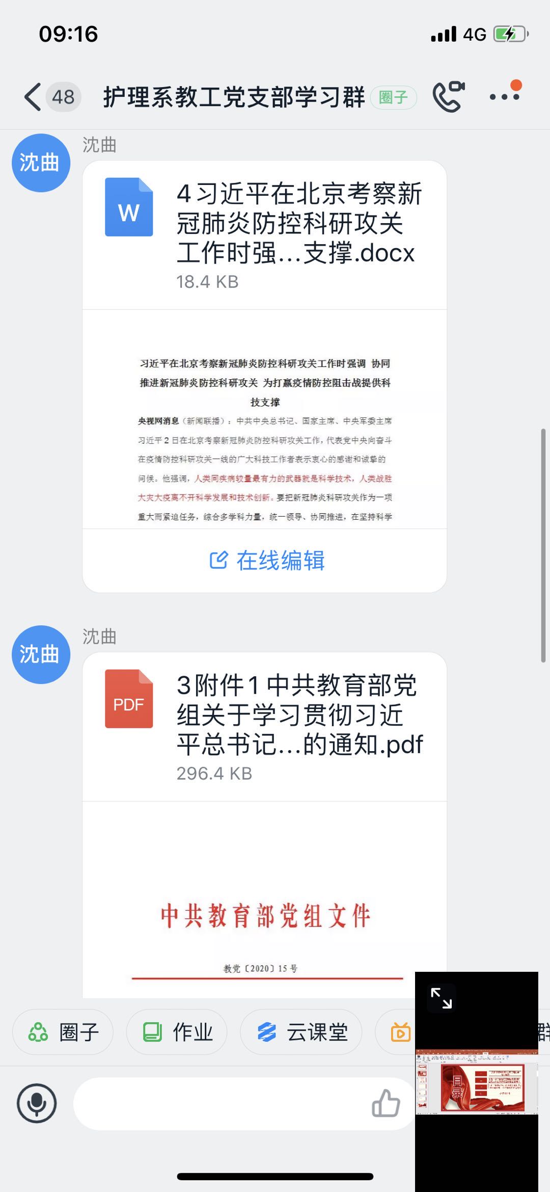 首先,支部学习活动的前一天支部书记沈曲老师把习近平总书记关于西藏学生回信、科研攻关重要精神的学习资料分享在学习群里,支部成员先进行自学;其次,活动当天大家根据支部书记沈曲老师分享的二维码邀请进群参加钉钉线上会议,伴随着沈老师的精心准备的PPT展示在钉钉会议屏幕上,全体成员领会了《关于开展2020年3月政治理论学习的通知》和《习近平在北京考察新冠肺炎防控科研攻关工作时强调协同推进新冠肺炎防控科研攻关为打赢疫情防控阻击战提供科技支撑》的文件精神,深入学习了《中共教育部党组关于学习贯彻习近平总书记给在首钢医院实习的西藏大学医学院学生重要回信精神的通知》的文件内容,同时配合雨课堂进行提问与讨论,全体成员热情响应,高度配合,积极的参加到学习中,值得一提的是“钉钉”和“雨课堂”的搭配使用让远程会议增添了灵动感和趣味性。