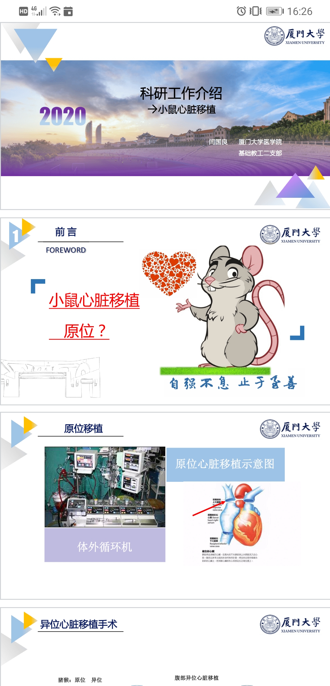 首先,新加入基础教工二支部的医学院党委副书记何丽苹同志围绕我院本科生思想政治学习、科技创新实践以及文体志愿活动等方面开展的工作向支部党员做了详细的介绍,让支部党员老师对我院本科生的教育工作有了更深入更全面的了解,并为支部与本科生党支部新学期拟开展的共建立项活动“师生支部共建,锤炼师德师风”提供了很多可供参考和借鉴的活动信息和资源。随后,周宇老师介绍了拟开展的支部共建活动的具体内容如“医路奋斗”主题师生交流活动,师生党员结队子帮扶学习困难学生等,并将结合本支部新学年开展的“党员自选主题分享30分”活动,拟选取精彩的支部党员演讲主题定期在我院学生宿舍园区的“一站式共享空间”开展面向我院本科生的教学和科研相关讲座活动,促进师生的交流。最后,支部党员闫国良老师通过PPT讲解、视频播放等形式做了题为“心脏移植动物模型介绍”的主题分享活动,分享了其十多年来做动物心脏移植手术的经验和收获,获得了支部全体党员的一致好评。