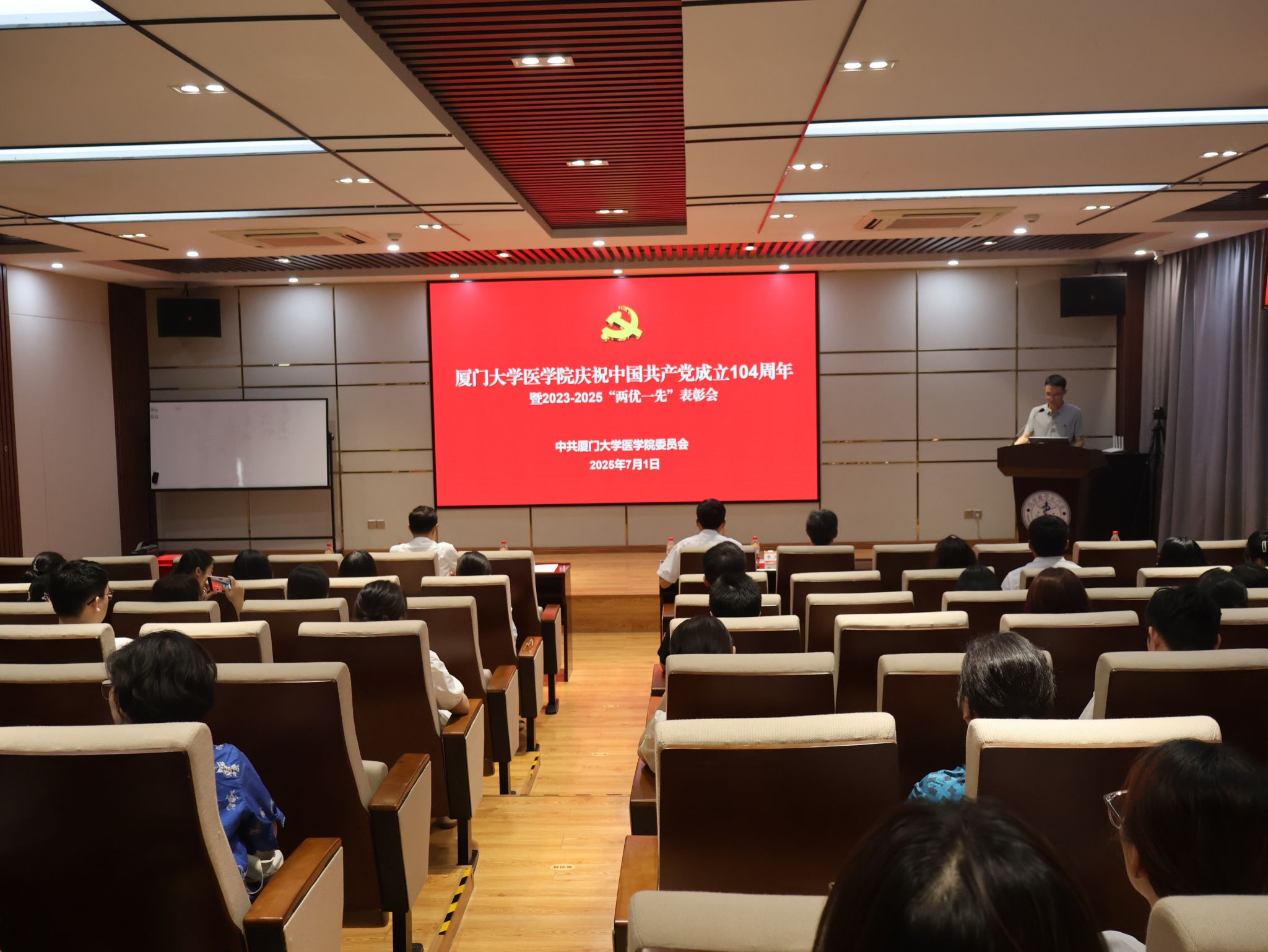 在中国共产党成立 104 周年之际,为深入推进党建引领与作风建设,7月1日下午,医学院举行庆祝中国共产党成立 104 周年暨 2023-2025 年“两优一先”表彰会。学院党委书记李峰,副书记王坤钟、辛晓丹,党委委员、副院长李文岗、李炜、张杰,受表彰的集体和个人代表、师生党员代表齐聚一堂,共庆党的生日。