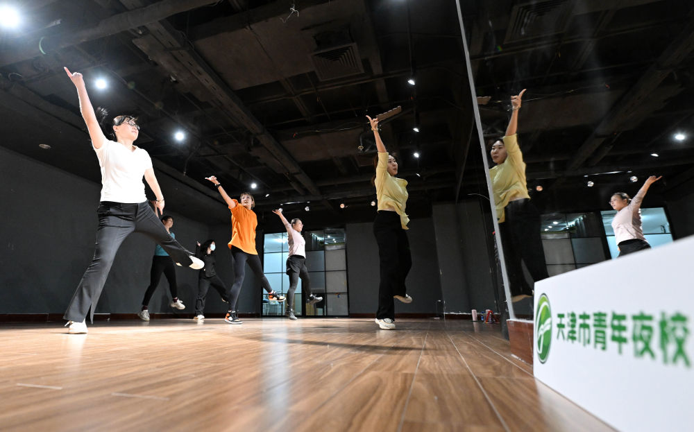 在天津青年宫,学员在青年夜校练习有氧健身舞(2024年4月23日摄)。