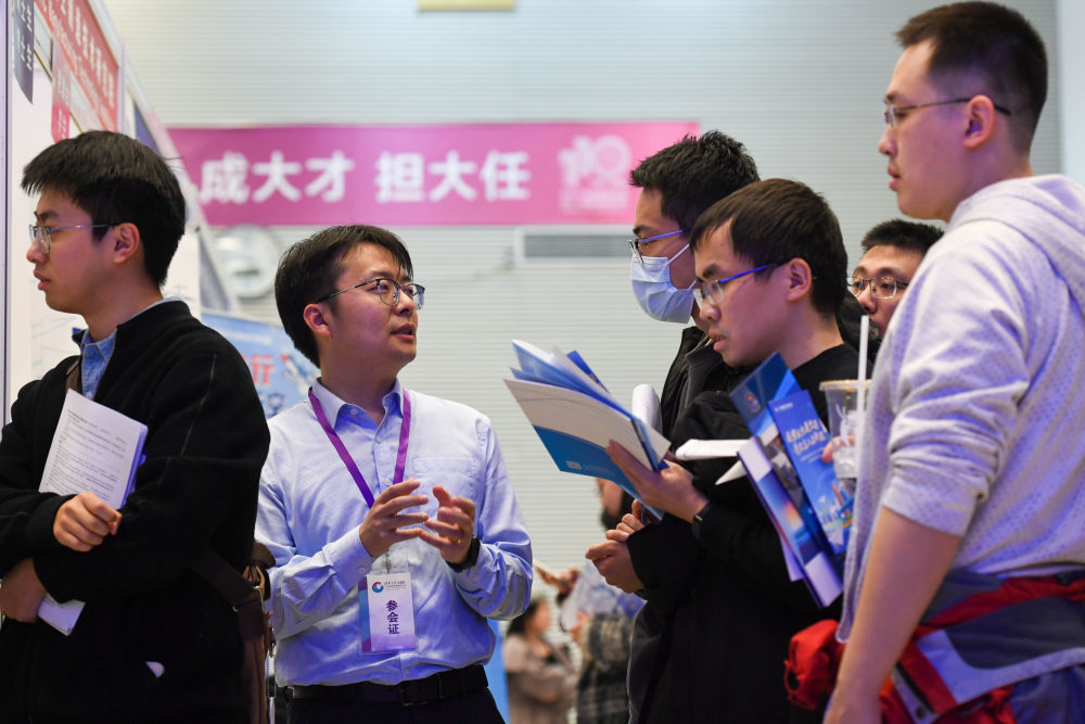 在清华大学举办的2024届毕业生大型就业洽谈会上,一名用人单位招聘人员(左二)与求职毕业生交流(2024年3月15日摄)。