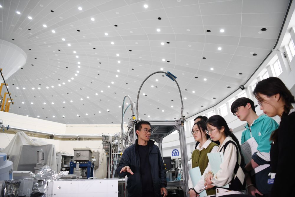 在中国科学技术大学国家同步辐射实验室,安徽省先进功能高分子薄膜工程实验室团队成员崔昆朋教授(左一)同学生交流(2024年4月6日摄)。