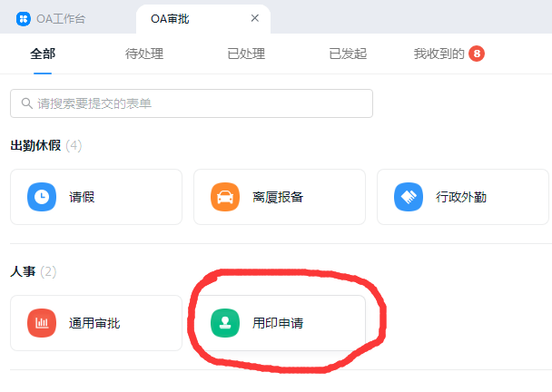 使用学院印章或抗癌研究中心印章,需分管院领导签字;教职工申请用印,可提前1天通过钉钉App中的“OA审批”→人事“用印申请”功能提交用印申请,提交学院分管院领导审批同意后携带需要盖章的材料到学院办公室(爱礼楼214)用印,用印材料内容需与钉钉审批通过的材料一致(如已完成领导手写签字的材料,无需再提交钉钉申请)。相关界面如下: