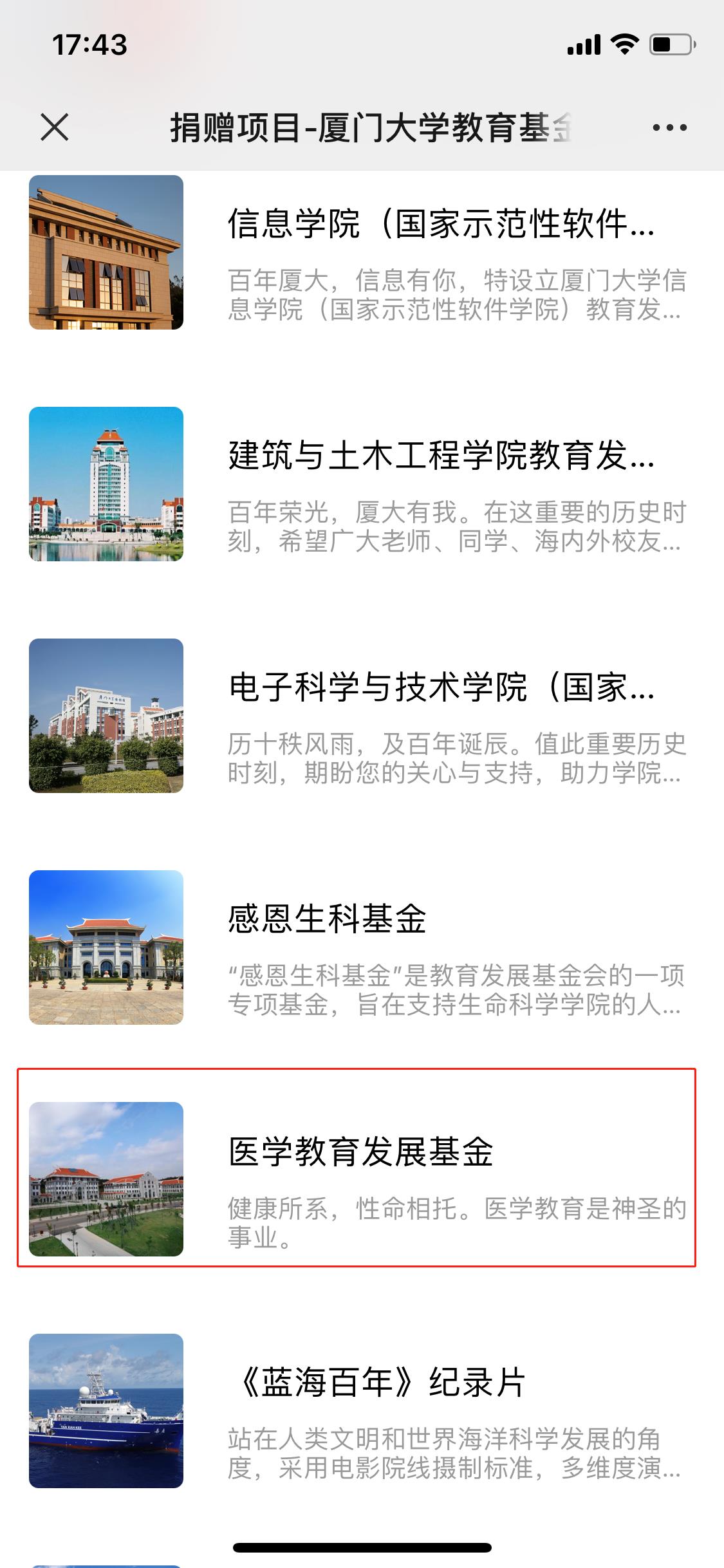 海纳百川、鼎力一流。过去的成就离不开大家的共同努力,未来的发展更需要大家的关心支持。为将厦门大学医科建设成为一流学科、将医学院建设成为一流学院,共同助力厦大“双一流”建设,我们谨向大家倡议:以向“厦门大学医学教育发展基金”捐赠的方式,为厦大100周年、厦大医学院25周年华诞献礼。