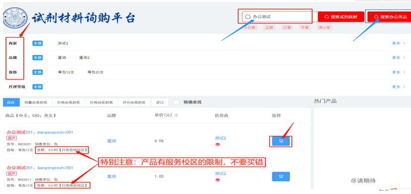 (3)在试剂耗材询购平台采购办公用品,一定要使用“搜索办公用品”栏目。