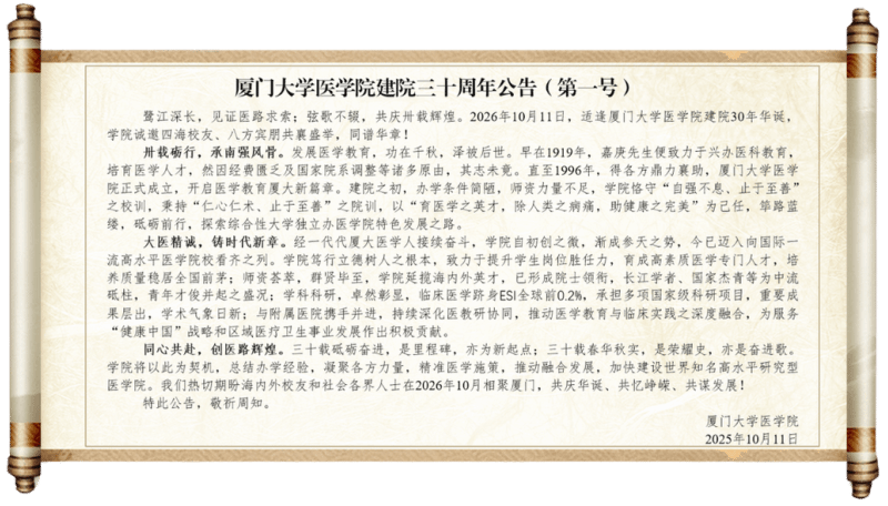 随后,与会人员前往成义楼中庭。学院党委书记李峰宣读了《厦门大学医学院建院30周年公告(第一号)》。