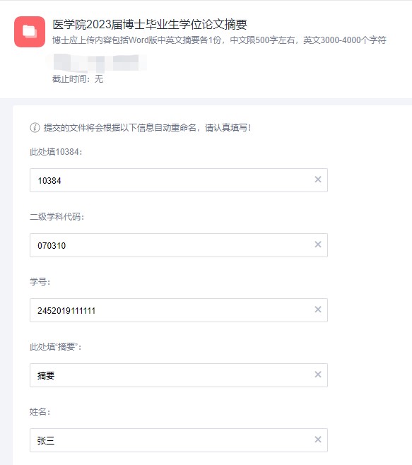 应上传内容包括Word版中英文摘要各1份,中文限500字左右,英文3000-4000个字符。摘要命名规则:“10384_二级学科码(即专业代码)_学号_摘要_姓名”,例如:“10384_010101_ 24520120153001_摘要_姓名”。 命名填写范例如下图: