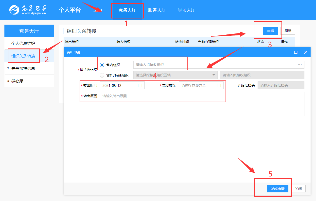 2.福建省内(不含厦门市)党员申请转入。党员登录“党员e家”平台(www.dyejia.cn)→点击“登录”→登录个人平台→进入“党务大厅”→选择“组织关系接转”→点击“申请”→选择“省内组织”→填写拟接收党支部名称(中共厦门大学医学院2023级新生临时周转委员会)→填写“转出时间”→填写“党费交至”时间→填写“转出原因类型”→填写“转出原因”→点击“发起申请”。即可发起在线转接流程,提交后由各级党组织管理员进行在线审批。党员要提醒转入单位及时办理和确认网上审批程序。