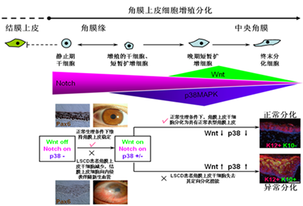 角膜上皮干细胞,作为角膜上皮的唯一细胞来源,对维持角膜上皮的动态稳定和角膜透明性发挥着极其重要的作用。角膜上皮干细胞功能障碍(limbal stem cell dysfunction,LSCD)的患者由于干细胞数量的缺乏或定向分化潜能丢失,往往表现为眼表组织广泛破坏,发生持续性角膜上皮缺损、慢性炎症、角膜上皮结膜化和新生血管侵入,继而角膜透明度下降,造成患者严重视力障碍甚至失明。大量研究证明,p38MAPK, Wnt, Notch等多种信号传导通路参与并调节了LSCD的发生进程。深入研究多条通路之间交叉作用的具体机制,必将为我们认识角膜上皮干细胞的生物学特性,阐明LSCD的发病机理提供重要信息。