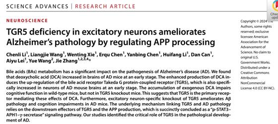 2024年6月28日,厦门大学医学院神经科学研究所张杰教授在Science Advances杂志上发表题为《TGR5 deficiency in excitatory neuronsameliorates Alzheimer's pathology by regulatingAPP processing》研究成果。揭示了脱氧胆酸(Deoxycholic acid,DCA)通过胆汁酸膜受体TGR5调控APP切割进而促进淀粉样蛋白(b-amyloid, Ab)产生的新机制,阐明了胆汁酸代谢紊乱在AD发生发展中的新机制,为AD的防治提供了新思路。