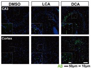 文章首先系统检测了不同月龄AD模型小鼠大脑中主要胆汁酸的水平,发现脱氧胆酸(DCA)在AD小鼠大脑及血浆中显著升高,并且随着AD疾病进展进一步升高。研究团队发现脱氧胆酸(DCA)喂养会损伤小鼠的认知功能,并惊奇发现DCA会诱导野生型小鼠大脑中产生大量淀粉样蛋白纤维聚集(Ab)。同样作为重要次级胆汁酸(Secondary bile acids)的石胆酸(Lithocholic acid, LCA)诱导Ab产生的作用很小(如下图):