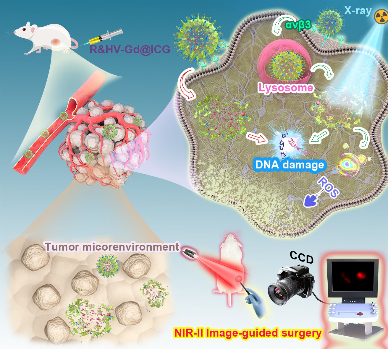 为此,研究团队通过多学科交叉合作,巧妙地构建了一种全新结构的多功能分子探针。动物实验发现,首先,该探针可通过靶向作用在肿瘤部位聚集,在激光照射下发出穿透力深的近红外二区荧光,把肿瘤的轮廓完整地描绘出来而利于实时可视化精准切除,降低肿瘤残留率,并且提高术后生存时间;其次,该探针可增强X线对肿瘤的杀伤作用,相比对照组,可显著抑制小鼠肿瘤的生长,提高放疗的疗效;第三,探针在肿瘤酸性环境中可较为快速地降解并且排出体内,突破了大多数无机纳米粒子在体内不可降解的局限,有利于降低无机纳米材料在体内的长期蓄积毒性并临床转化应用。