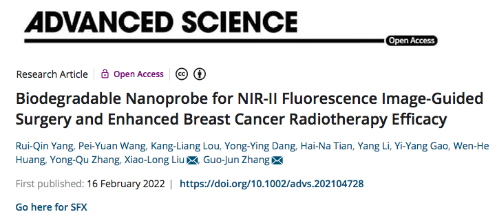 近日,厦门大学附属翔安医院执行院长、医学院张国君教授团队及中科院福建物质结构研究所刘小龙教授团队在国际知名综合性期刊Advanced Science(IF 16.8)上联合发表论文“Biodegradable Nanoprobe for NIR-II Fluorescence Image-Guided Surgery and Enhanced Breast Cancer Radiotherapy Efficacy”,阐述了一种基于生物体内可降解纳米探针、可用于乳腺癌手术导航和放疗增敏的多功能诊疗平台。厦门大学医学院博士研究生杨瑞钦及中国科学院福建物质结构研究所王培园副研究员为本文共同第一作者,张国君教授及刘小龙教授为本文通讯作者。相关工作得到了国家自然科学基金、福建省科技重大专项专题等5项基金的资助。