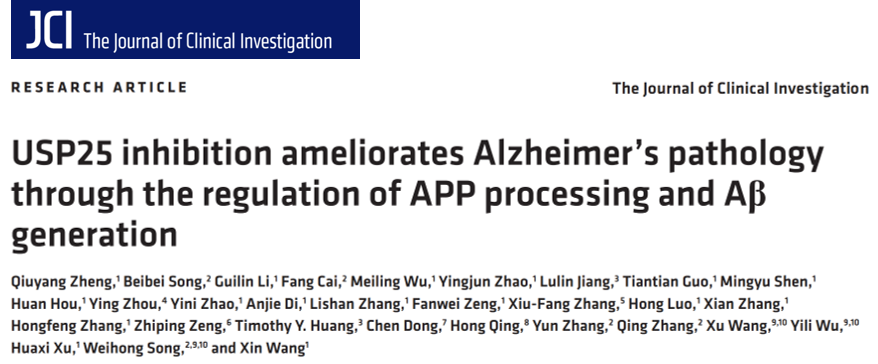 3月2日,厦门大学医学院神经科学研究所王鑫、许华曦教授和加拿大不列颠哥伦比亚大学/温州医科大学宋伟宏教授课题组合作在Journal of Clinical Investigation上发表题为“USP25 inhibition ameliorates Alzheimer’s pathology through regulating APP processing and Aβ generation”的研究成果,深入探讨了唐氏综合征21-三体加剧阿尔茨海默病(Alzheimer’s disease,AD)神经病理发生的分子机制,揭示了泛素特异性蛋白酶USP25可同时靶向反应性小胶质细胞激活和β-淀粉样蛋白(β-amyloid, Aβ)产生。此外,该研究利用USP25小分子抑制剂成功地减轻了AD小鼠的淀粉样病理并抑制AD相关的认知缺陷,指出USP25可能作为AD的潜在治疗靶点。