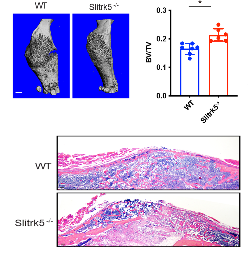 外源Hedgehog信号对于机体骨形成与骨量累积至关重要,然而在成骨细胞中感应和调控hedgehog信号的细节机制还有待进一步解明。许韧教授的一系列前期工作证明:神经轴突化学导向因子在成骨细胞中高度表达,以自分泌和旁分泌的形式在骨稳态中发挥重要的生理学功能。本项研究便聚焦于一种新型的神经化学导向因子-SLITRK5,发现其在成骨细胞中特异性表达,并作为hedgehog信号的负调控因子来影响机体的成骨活性。体外缺失SLITRK5导致hedgehog信号通路增强,成骨细胞中过表达SLITRK5抑制hedgehog信号下游靶点的输出。在机制上SLITRK5定位于初级纤毛中,通过其胞外结构域与hedgehog配体结合,并通过其胞内结构域与受体PTCH1相互作用;SLITRK5的缺失增强了hedgehog信号刺激下SMO蛋白在纤毛的富集,促进机体骨折的愈合。因此,SLITRK5作为成骨细胞中特异的hedgehog信号负调控因子,是一种临床潜能可期,具有开发价值的骨科疾患治疗靶点。