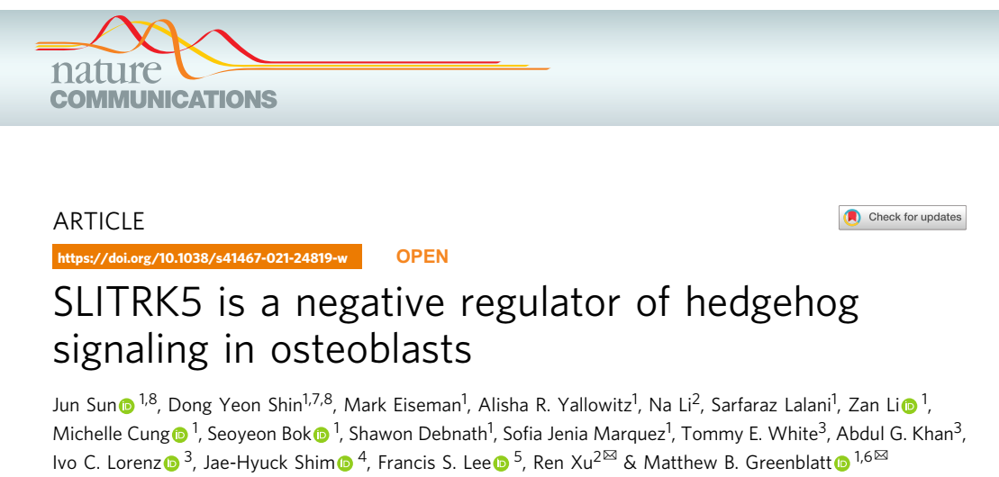 2021年7月29日,厦门大学医学院/细胞应激生物学国家重点实验室-许韧教授课题组与美国康奈尔大学威尔医学院病理学系-Matthew Greenblatt教授实验室合作在《Nature Communications》上发表题为“SLITRK5 is a negative regulator of hedgehog signaling in osteoblasts”的研究论文,首次报道了一种成骨细胞特异性的Hedgehog信号分子开关-SLITRK5,可以有效的调节机体成骨活性与稳态,具有重要的临床开发潜能。