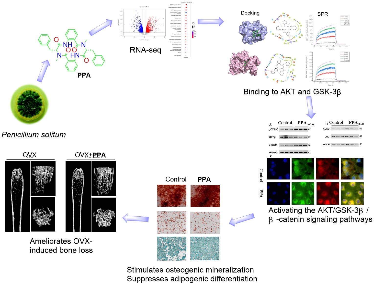 许韧教授团队通过大规模成骨矿化活性筛选,发现了深海多肽化合物Penicopeptide A。它不仅在体外能够有效促进小鼠骨髓间充质干细胞(BMSCs)和小鼠颅盖骨成骨细胞系MC3T3-E1的成骨矿化,从而实现成骨细胞活性的显著提高,并且在小鼠OVX(去卵巢)模型体内可有效促进小鼠的骨形成,预防性激素缺乏引起的骨质疏松。机制上,PPA通过靶向AKT和GSK-3β蛋白,并激活AKT和GSK-3β的磷酸化,导致β-连环蛋白的积累,从而上调成骨特异性基因Alpl, Runx2, Ibsp和 Bglap以及抑制成骨负调控基因HIVEP3的表达,最终促进成骨细胞的分化和矿化过程。