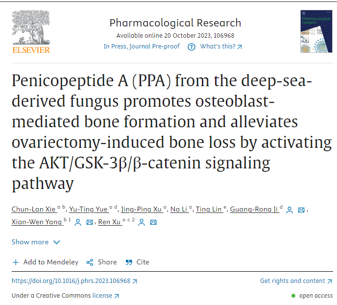 2023年10月23日,厦门大学医学院许韧教授与自然资源部第三海洋研究所杨献文研究员合作,筛选出一种深海多肽化合物Penicopeptide A,能有效预防雌激素缺乏引起的骨质疏松,为治疗抗骨质疏松药物提供了新颖的活性先导化合物。该研究成果已申请了一项国家发明专利,并以“Penicopeptide A (PPA) from the deep-sea-derived fungus promotes osteoblast-mediated bone formation and alleviates ovariectomy-induced bone loss by activating the AKT/GSK-3β/β-catenin signaling pathway”为题发表在药理学TOP期刊Pharmacological Research杂志(中科院分区:医学、药学双一区杂志)。