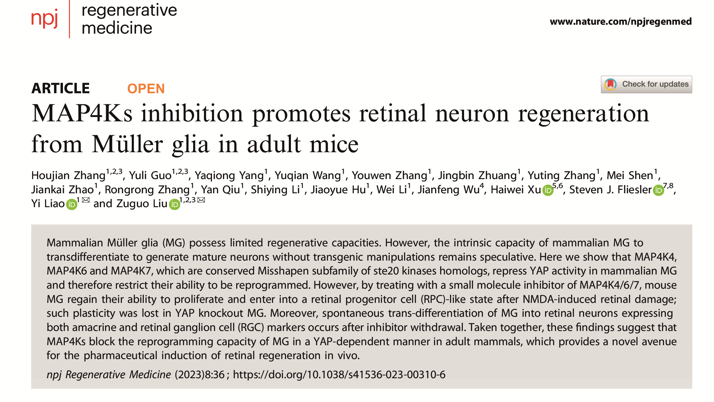 2023 年 7 月 13 日,厦门大学眼科研究所刘祖国教授和廖怿助理教授团队在 NPJ Regenerative Medicine 上在线发表题为 MAP4Ks inhibition promotes retinal neuron regeneration from Müller glia in adult mice 的研究论文。该研究发现,在成年小鼠视网膜损伤后,Hippo信号通路旁路途径的关键上游激酶MAP4K4、MAP4K6和MAP4K7(MAP4Ks)通过磷酸化下游底物抑制转录共激活因子YAP的活性,进而抑制穆勒细胞的神经元再生能力。采用小分子药物DMX-5804 靶向MAP4Ks可以促进损伤视网膜中的穆勒细胞再生功能性神经元。