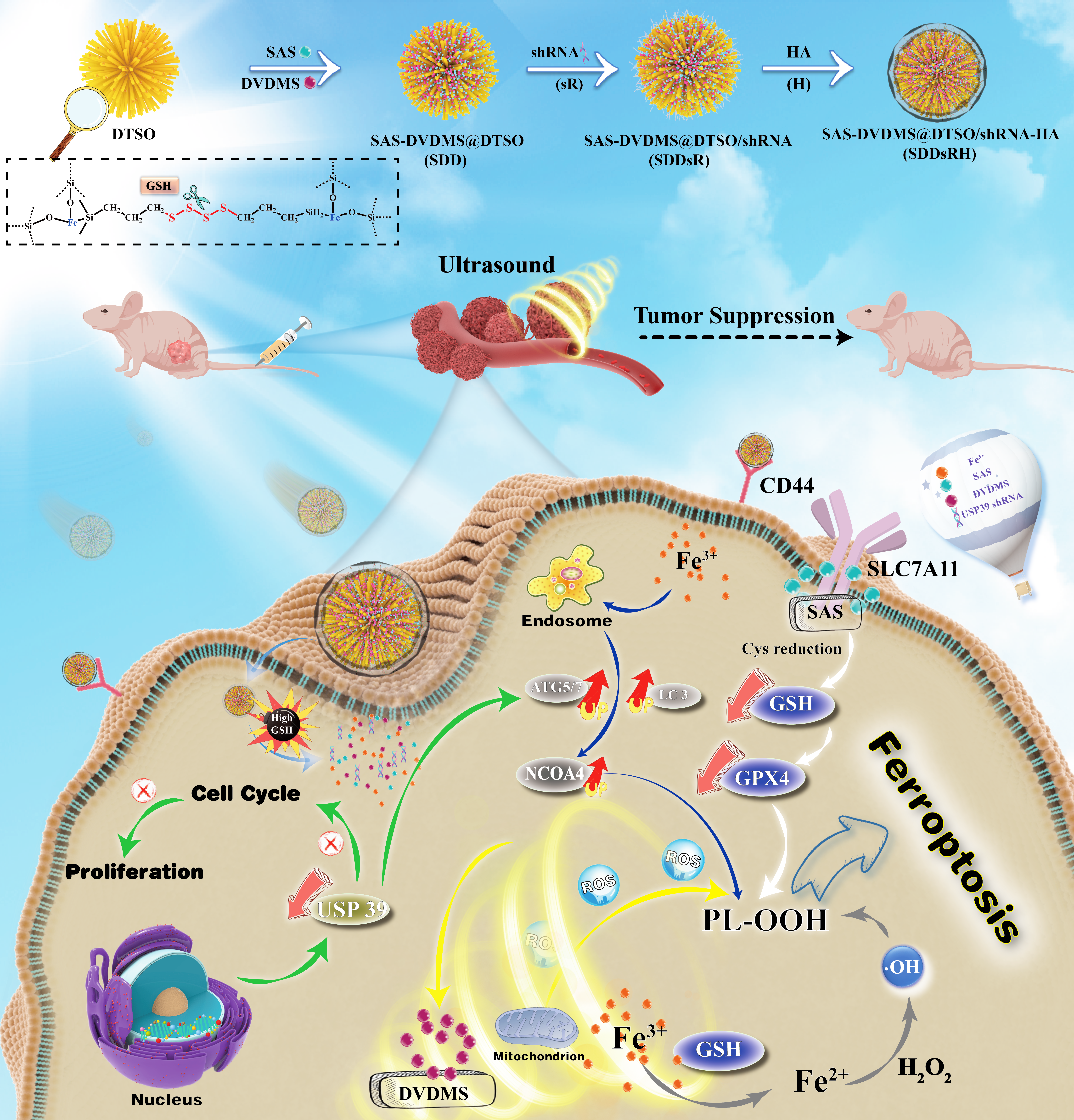 基于此,课题组设计构建了一种谷胱甘肽(GSH)多级响应的纳米反应器(SDDsRH),可高效耗竭GSH并实现将SDT、CDT及肿瘤特异性基因沉默协同用于结肠癌靶向治疗。他们首先制备富含Fe3+/四硫键(-s-s-s-s-)的树枝状二氧化硅纳米颗粒(DTSO),将声敏剂华卟啉钠(DVDMS)、柳氮磺吡啶(SAS)和USP39 shRNA包载到DTSO中,表面再修饰透明质酸(HA)。HA可与肿瘤细胞膜上的CD44受体结合,靶向识别肿瘤细胞增强纳米药物在肿瘤组织的聚集并促进其内吞。SDDsRH进入肿瘤细胞后,与过量产生的GSH发生氧化还原反应,四硫键断裂后纳米反应器降解释放出负载的药物,同时生成了Fe2+和GSSG。释放的DVDMS在超声辐照下激活催化氧产生大量的ROS,SAS可与SLC7A11结合阻断GSH的再合成,Fe2+可以催化Fenton样反应,利用H2O2产生•OH和ROS。这两个过程均可迅速消耗肿瘤细胞中原有的GSH。大量消耗GSH后,肿瘤细胞的抗氧化能力显著降低,同时在ROS作用下大量LPO积累,从而诱导细胞发生铁死亡。此外,靶向递送的USP39 shRNA有效沉默了USP39基因表达,抑制了肿瘤细胞的增殖,同时促进了ATG5基因表达,增强肿瘤细胞铁死亡。该研究为恶性肿瘤的靶向协同治疗提供了一种高效有前景的治疗策略。