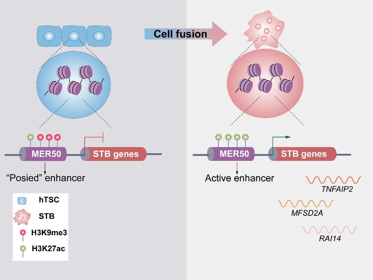 近日,曹彬教授课题组在Nucleic Acids Research杂志上在线发表了题为Endogenous retrovirus-derived enhancers confer the transcriptional regulation of human trophoblast syncytialization的研究论文,揭示了内源性逆转录病毒(Endogenous retroviruses,ERVs)来源的增强子调控滋养层细胞合体化转录特征的全新机制。ERV约占人类基因组序列的8%,是数百万年前逆转录病毒感染人类生殖系细胞后留存在基因组中的“遗迹”。除编码蛋白外,ERV元件可通过衍生顺式调控元件、提供剪接和终止位点,以及调控非编码RNA等方式发挥复杂的转录调控作用。曹彬教授团队通过高通量转录组和表观基因组测序分析,首次描绘了ERVs衍生增强子在人滋养层干细胞合体化过程的动态表观遗传学图谱。发现ERV增强子兼具H3K27ac和H3K9me3的双价修饰特征,其在合体化过程中丢失抑制型的H3K9me3修饰而转变为转录调控激活状态。其中,来自ERV1家族的MER50双价增强子可调控滋养层合体化关键基因的转录激活,进而影响滋养层合体分化的效率。该研究揭示了内源性逆转录病毒参与胎盘发育调控的新机制,为从表观遗传的视角解密人类胎盘发育的“黑匣子”提供了全新的研究思路。(原文链接:https://academic.oup.com/nar/advance-article/doi/10.1093/nar/gkad109/7067945?login=true)