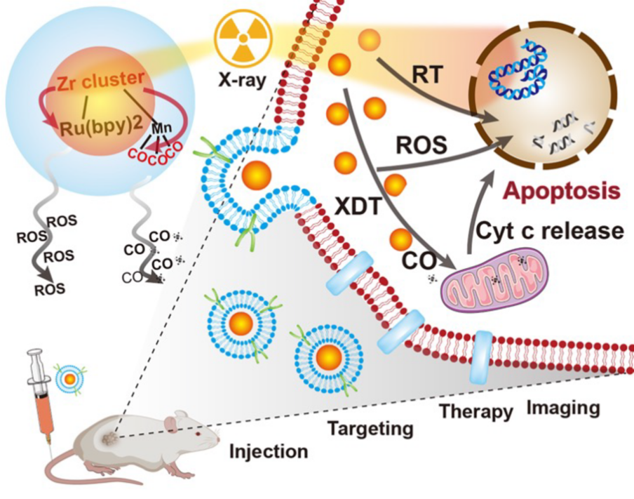 近日,医学院眼科研究所楚成超副教授和公共卫生学院刘刚教授合作在化学领域国际顶级期刊Angew Chem Int Edit在线刊发了题为“Ru-based Metal-Organic Nanoradiosensitizers Enhance Radiotherapy by Combining ROS Generation and CO Gas Release”的研究成果。