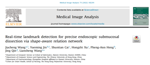 消化病学系、消化道肿瘤早诊早治亚专科与厦门大学信息学院王连生教授团队共同设计完成题为《Real-time landmark detection for precise endoscopic submucosal dissection via shape-aware relation network》的研究发表在Medical image analysis杂志。该课题提出了一种新颖的形状感知关系神经网络,用于在内窥镜黏膜下剥离术 (ESD) 手术中进行准确和实时的标记检测,极大提高了手术的精度和效率,尤其是为ESD手术培训提供了保驾护航的“第三只眼”。