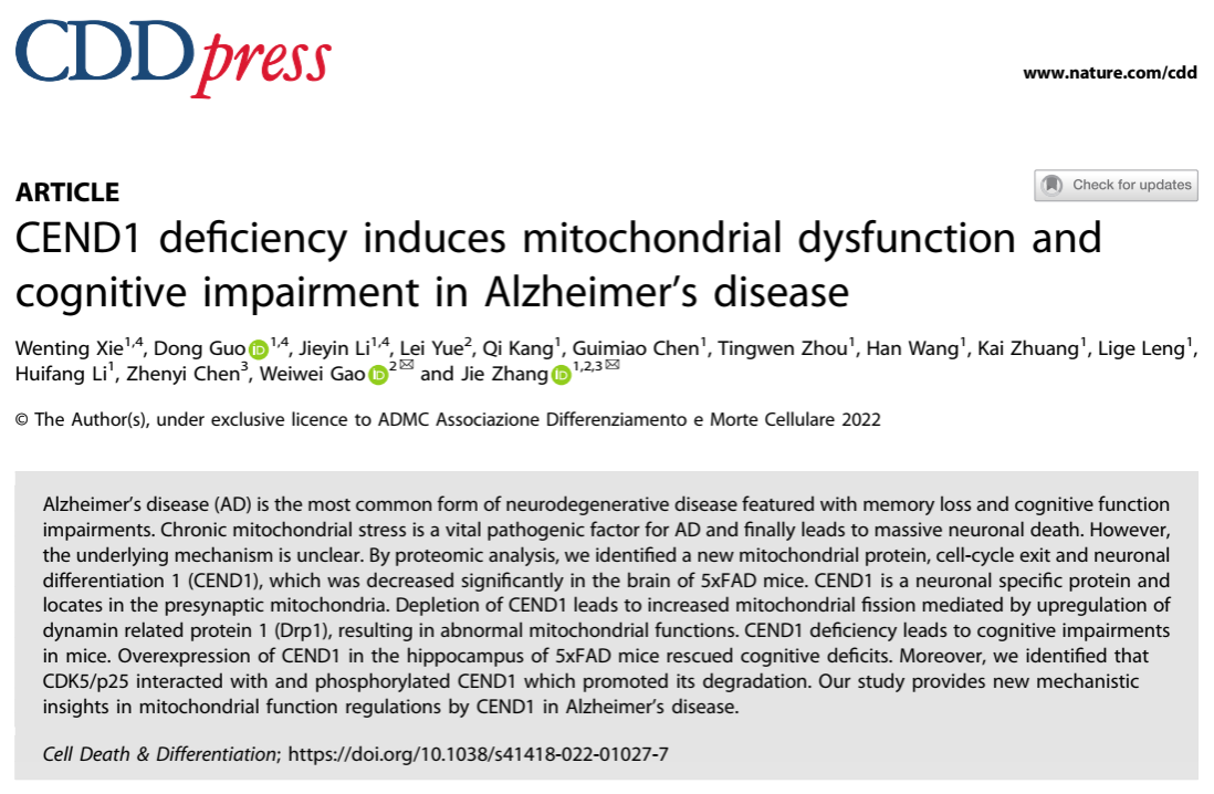6月22日,厦门大学医学院神经科学研究所张杰教授团队在Nature旗下期刊Cell Death & Differentiation (IF:15.8)杂志上发表题为“CEND1 deficiency induces mitochondrial dysfunction and cognitive impairment in Alzheimer’s disease”的研究论文。该研究鉴定出了一个新的线粒体蛋白CEND1,并阐明了CEND1调控线粒体融合分裂导致AD发生发展的机制,为AD的防治提供了新靶点。