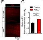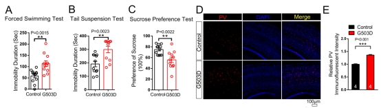 2018年,张杰教授团队在Neuron杂志上发表文章,对1000多例重度抑郁患者和800多例对照人群的血液外显子测序中,发现了一个全新的与抑郁相关的MEN1SNPrs375804228)。在基础上,构建了对应Men1-SNP突变的小鼠Men1G503D)。通过稳定代数的交配后,检测到Men1G503D)点突变小鼠表现出显著的抑郁样的表型。通过脑片的免疫荧光染色,该团队还发现Men1G503D)小鼠脑中小清蛋白(ParvalbuminPV;基因Pvalb)的表达水平显著升高。通过构建一系列条件性敲除Men1的小鼠,该团队发现在PV神经元中敲除Menin可以显著升高PV的表达水平,并导致小鼠表现出抑郁表型。