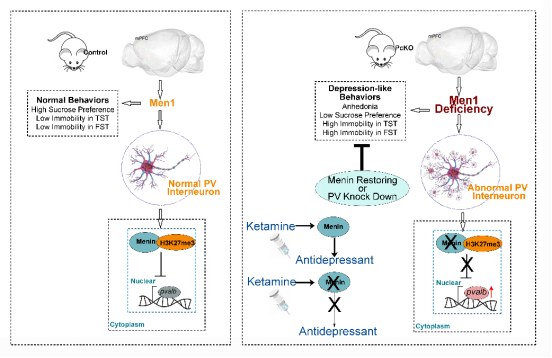 张杰教授、冷历歌教授团队阐明氯胺酮抗抑郁的新机制,发现氯胺酮可以稳定Menin蛋白水平,调控PV神经元功能,参与抑郁的发生发展
