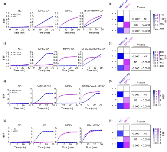 通过结合Cas12a和Cas13a系统并优化反应设置,该团队证明了该方法能够检测单个样本中MPXV的两个基因靶标。双靶标检测分析能够在RAA后10分钟内区分MPXV-CA和MPXV-WA进化枝。此外,考虑到检测MPXV与SARS-CoV-2或HIV等合并感染对于有效治疗和疾病预防的重要性,该团队的双靶点检测方法展示了其同时检测MPXV与SARS-CoV-2的效率。这种多重检测方法不仅提供了一种快速且经济有效的方法来检测MPXV并区分其进化枝,而且还提供了检测合并感染的能力。