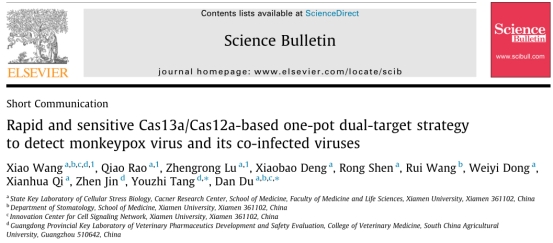 目前,厦门大学医学院杜丹教授与华南农业大学兽医学院汤有志教授团队合作,在Science Bulletin (Multidisciplinary Sciences)杂志上发表题为“Rapid and sensitive Cas13a/Cas12a-based one-pot dual-target strategy to detect monkeypox virus and its co-infected viruses”的研究论文。