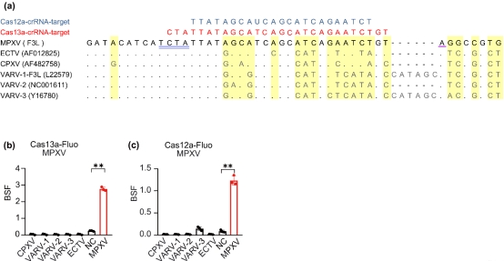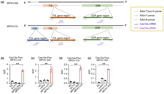 猴痘病毒(MPXV)分为两个亚种:中非型(MPXV-CA)和西非型(MPXV-WA),它们在地理上有明显的分布差异,具有不同的临床表现和流行病学特点,表现出不同程度的致病性。中非型猴痘(MPXV-CA)与较高的致死率(约为10%)相关,对公共卫生构成重大威胁,而西非型猴痘(MPXV-WA)病毒感染导致较轻的人类疾病(约为3.6%的致死率)。临床严重性的差异可能归因于亚种之间的基因组差异。该团队根据两个亚型基因组的差异,设计了不同的靶向crRNA,其对应的Cas13a和Cas12a检测系统能特异性识别和区分该不同病毒亚型,有助于疾病防控的决策制定。