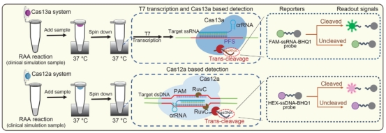 RAA-Cas13a和RAA-Cas12的阳性检出率高于qRT-PCR的检测方法,并且不需要昂贵的仪器和复杂的操作步骤。