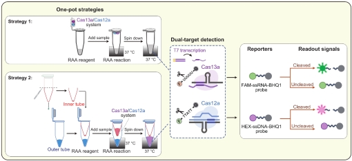 根据世界卫生组织(WHO)的流行病学数据,约有51%的猴痘病毒(MPXV)感染病例同时也被人类免疫缺陷病毒(HIV)感染。研究表明HIV和MPXV可能互相促进传播。疾病预防控制中心(CDC)强调,接受猴痘病毒感染检测的个体应同时进行HIV检测和预防服务。此外,在COVID-19疫情期间,有关猴痘病毒和严重急性呼吸综合症冠状病毒2(SARS-CoV-2)共感染发病率案例逐渐增加。多重检测涉及同时检测多个基因或靶标,是最大限度降低假阴性结果风险的可靠方法。该团队成功开发了基于RAA-Cas12a/Cas13a的双靶点检测方法。