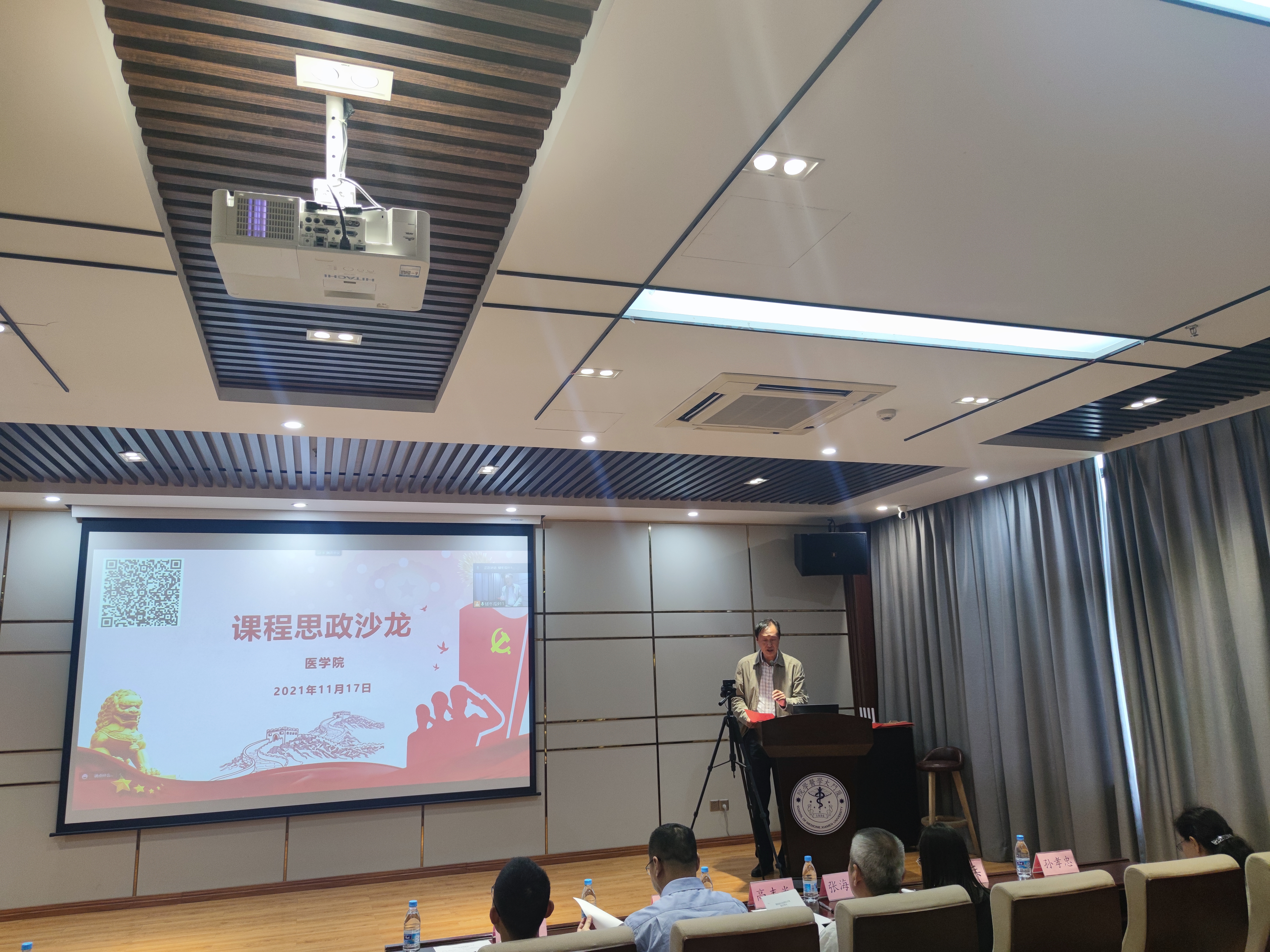 11月17日上午10点,医学院党委、教务办、研究生办在成义楼102联合举办了“课程思政”教学沙龙活动,腾讯会议平台面向附属医院临床教师进行了同步直播。副院长薛茂强教授主持了此次教学沙龙活动,基础医学部张兵教授、中医系孙孝忠副教授、临床医学专硕教师刘文戈副研究员三位老师依次做课程思政案例及课程思政建设成果分享。党委副书记王坤钟老师、基础医学部主任高丰光教授、中医系副主任文磊教授、教务办主任李晴副教授出席活动。