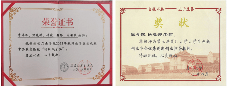 2023年喜获医学院教学技能大赛团队风采奖,第九届全国大学生基础医学创新研究暨实验设计论坛获得优秀指导教师,厦门大学大学生优秀创新创业指导教师及厦门大学我最喜爱的十佳教师称号。