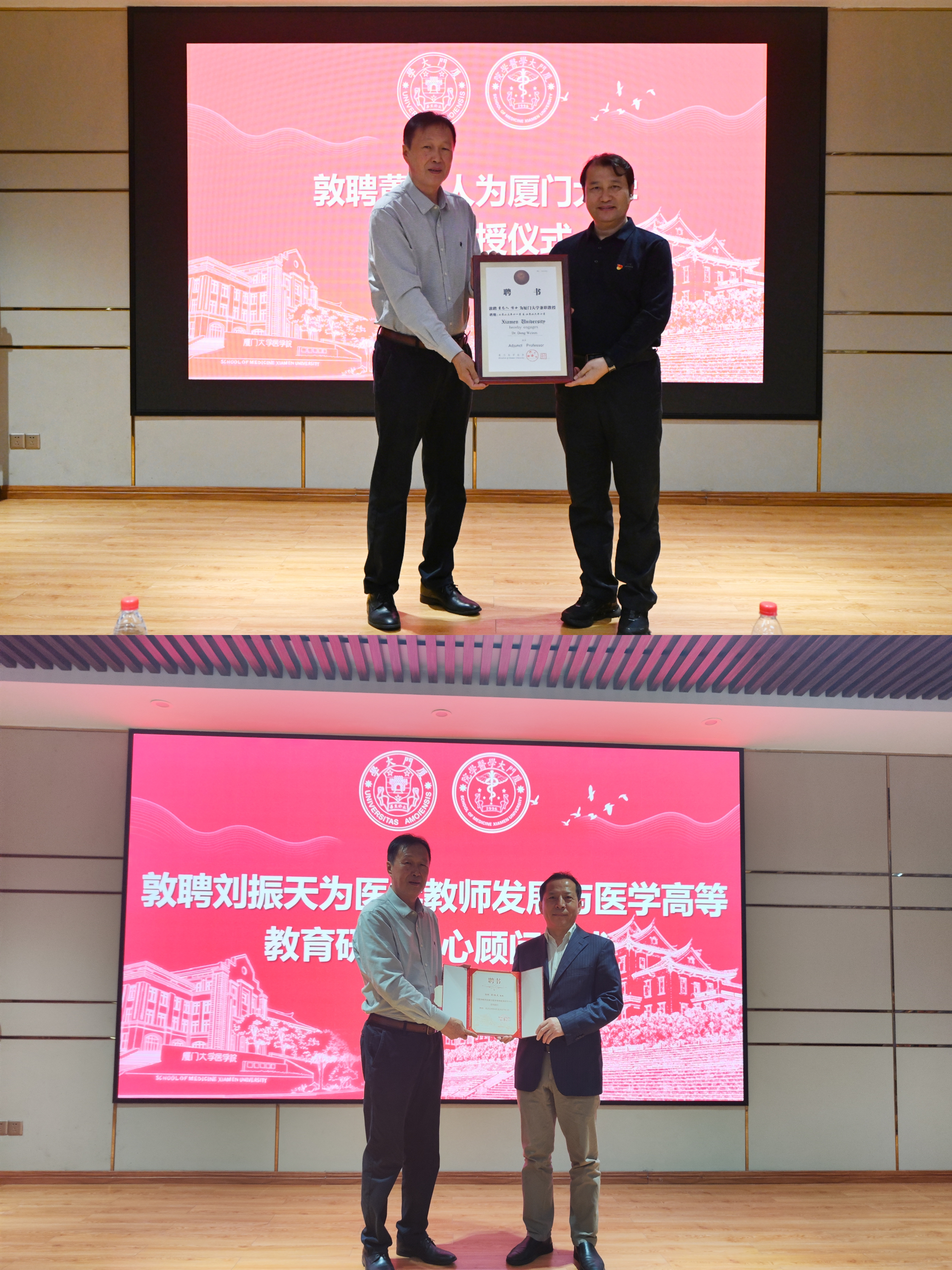为进一步促进医学教育教学发展,培训会上举行了隆重的敦聘仪式。特聘请董为人教授为厦门大学兼职教授,聘请刘振天教授为医学教师发展与医学高等教育研究中心顾问。医学院副院长薛茂强为2位专家颁发聘书。