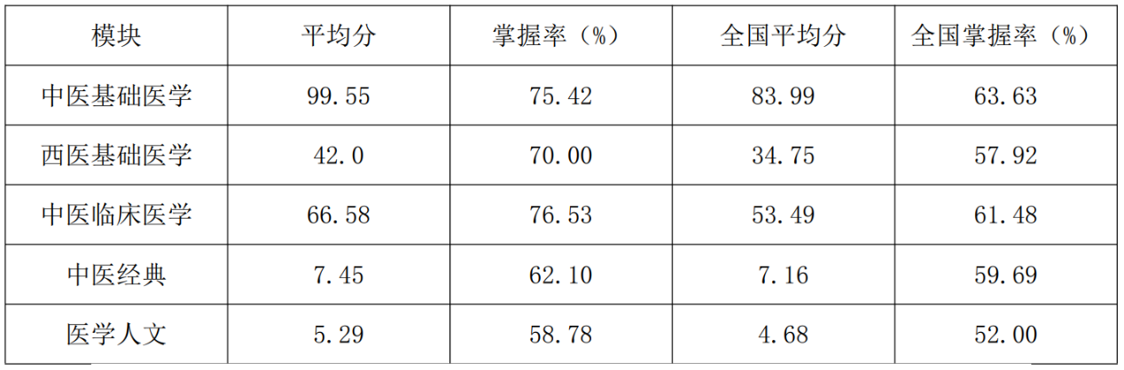 我校中医学专业四年级(2020级)31名学生全部参加考核:其中医学基本知识考试平均成绩为220.87,通过28人,通过率90.32%,全国排名第一;临床基本技能考试平均成绩为92.47,通过31人,通过率100%,全国排名第一;总通过率90.32%,高于全国平均36.37个百分点(全国平均通过率为53.95%),全国排名第一。