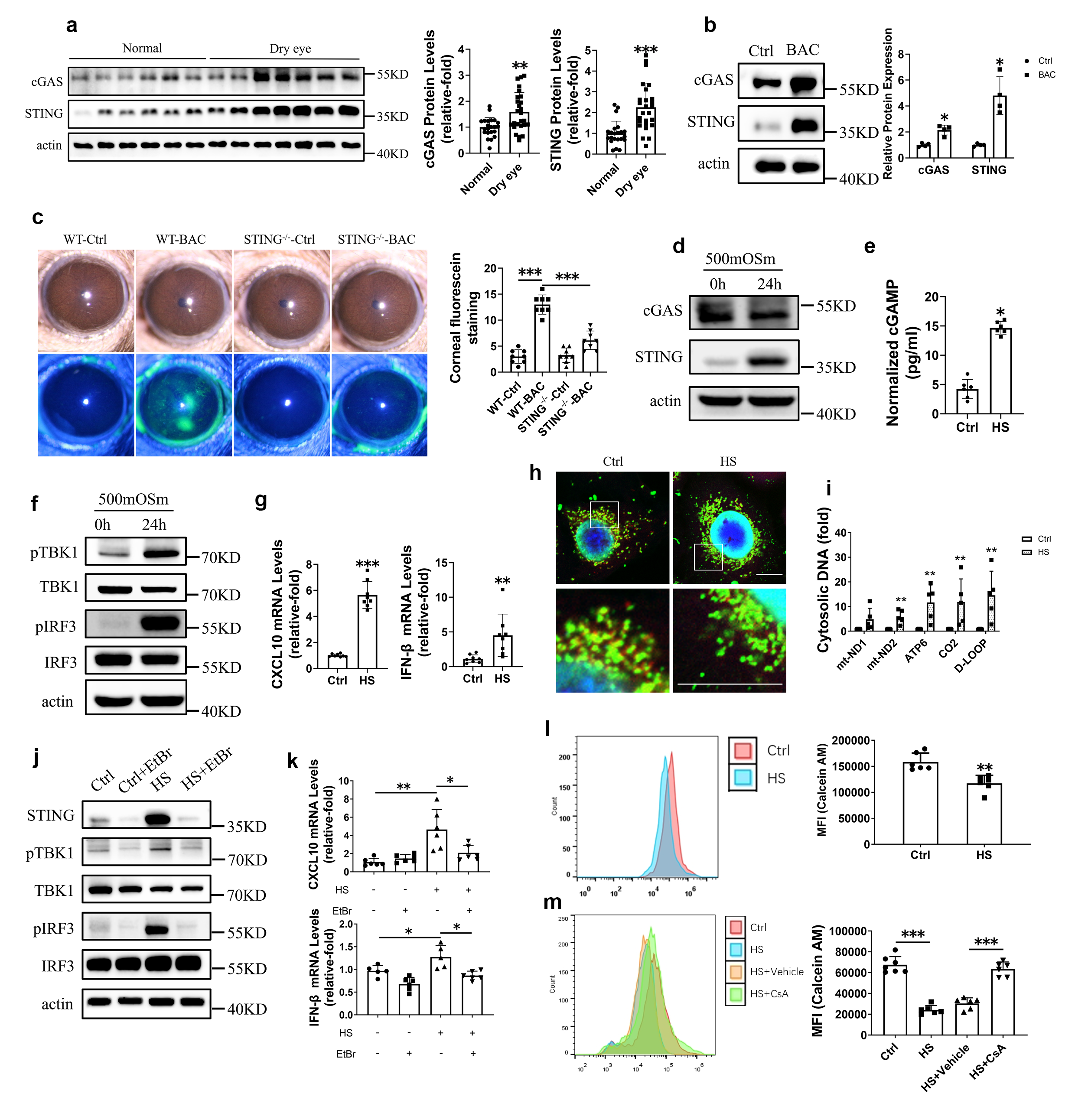 泪液渗透压升高是干眼对眼表炎症和角膜损伤的重要病理机制,为了进一步探索cGAS-STING信号通路在干眼病理生理过程中的作用,研究人员在高渗条件下培养角膜上皮细胞(HCE),发现高渗导致cGAS和STING水平升高,cGAMP的产生,TBK1和IRF3的磷酸化,以及炎症细胞因子的上调。进一步利用小干扰RNA进行的研究证实,敲降cGAS或STING显著减少了HCE中高渗应激引起的炎症反应。此外,研究人员观察到在暴露于高渗应激的HCE中线粒体形态学变化、线粒体钙离子水平增加和线粒体超极化等改变,导致线粒体功能障碍,引起线粒体渗透转换孔(mPTP)开放,随之mtDNA释放到胞质中。使用临床上治疗干眼的药物环孢素(CsA)可以逆转mPTP的开放以及EtBr耗竭胞质内的mtDNA,均能有效降低cGAS-STING通路的激活及下游炎症因子的表达。