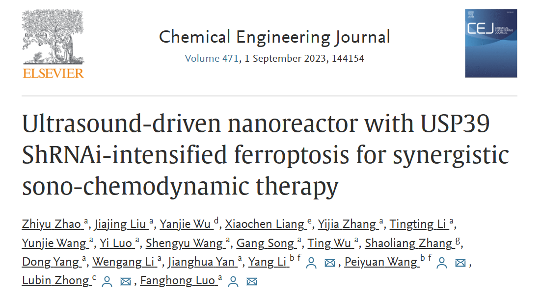 近日,医学院抗癌研究中心罗芳洪课题组在化工领域国际顶级期刊《Chemical Engineering Journal》发表了题为“Ultrasound-Driven Nanoreactor with USP39 ShRNAi-Intensified Ferroptosis for Synergistic Sono-Chemodynamic Therapy”的研究论文。论文报道了一种肿瘤微环境响应的超声驱动纳米反应器,可靶向肿瘤组织并通过基因沉默增强声动力-化学动力效应诱导肿瘤细胞铁死亡,发挥协同抗肿瘤作用,可望为肿瘤的靶向协同治疗提供一种新策略。